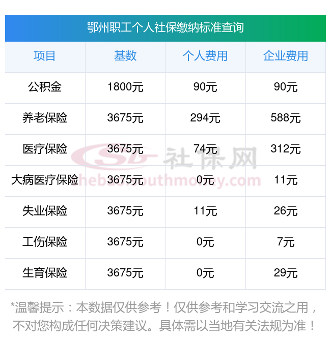 鄂州五险一金交多少钱一个月?下表是2024-2025年鄂州社保费用明细参考,新社通app-社保缴费查询工具提供的最新数据如下: