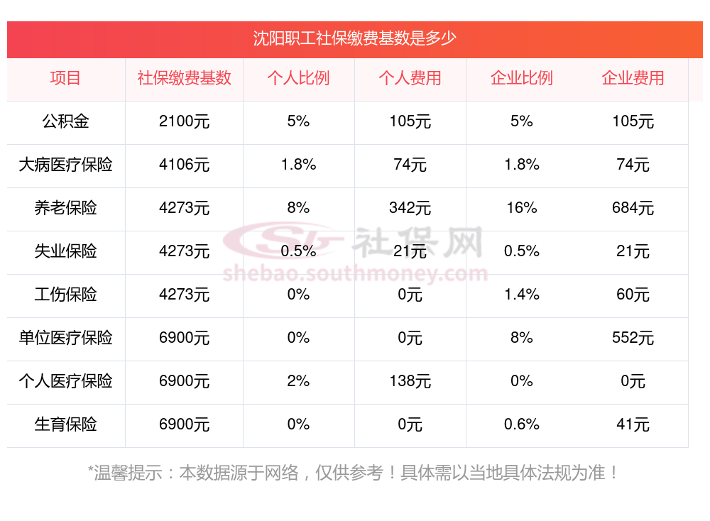 2025年沈阳社保缴费多少钱?下表是2024-2025年沈阳社保费用明细参考,新社通app-社保缴费查询工具提供的最新数据如下: