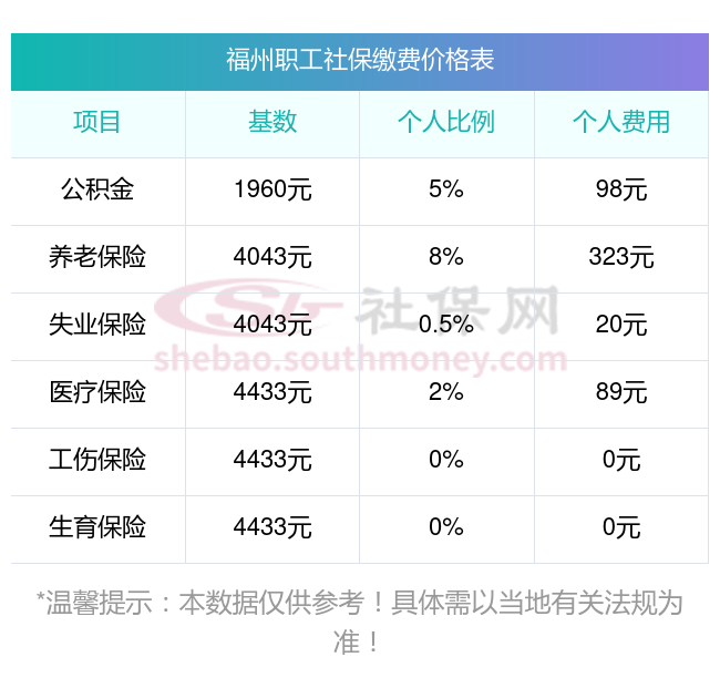 2025年福州社保缴费价格,2025年福州社保缴费多少钱?下表是2025年福州社保费用明细参考,新社通app-社保缴费查询工具提供的最新数据如下: