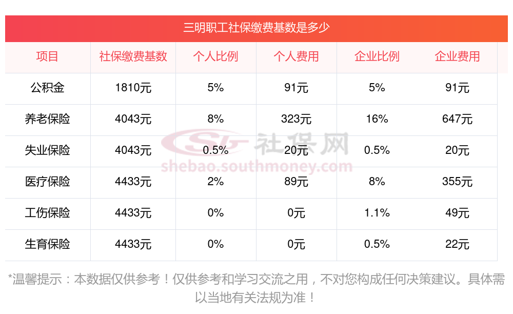 2025年三明五险缴费标准是多少,2025年三明社保缴费多少钱?下表是2025年三明社保费用明细参考,新社通app-社保缴费查询工具提供的最新数据如下: