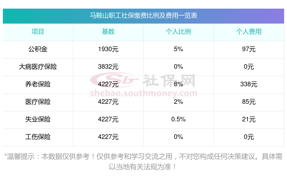 安徽马鞍山缴费社保比例一览 社保公司和个人各交多少?下表是2024-2025年安徽马鞍山社保费用明细参考,新社通app-社保缴费查询工具提供的最新数据如下: