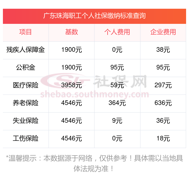2025年广东珠海社保缴费价格标准是多少,2025年广东珠海社保缴费多少钱?下表是2025年广东珠海社保费用明细参考,新社通app-社保缴费查询工具提供的最新数据如下: