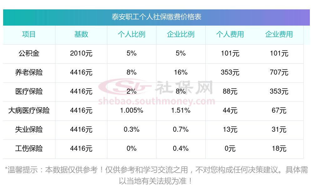 泰安2025年社保养老保险缴费标准是多少?下表是2025年泰安社保费用明细参考,新社通app-社保缴费查询工具提供的最新数据如下: