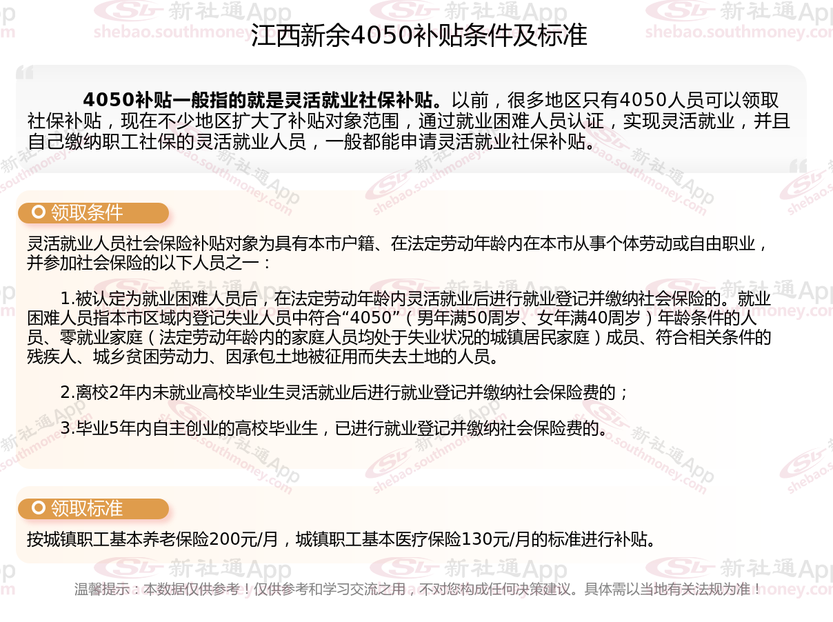 二、江西新余4050社保补贴多少钱一个月?江西新余4050社保补贴2025年最新标准是多少?