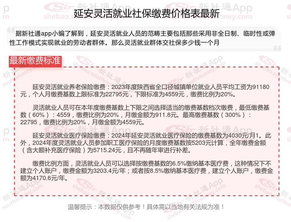 延安灵活就业人员的社保缴费标准是多少?根据新社通app-社保缴费查询工具提供的最新数据如下: