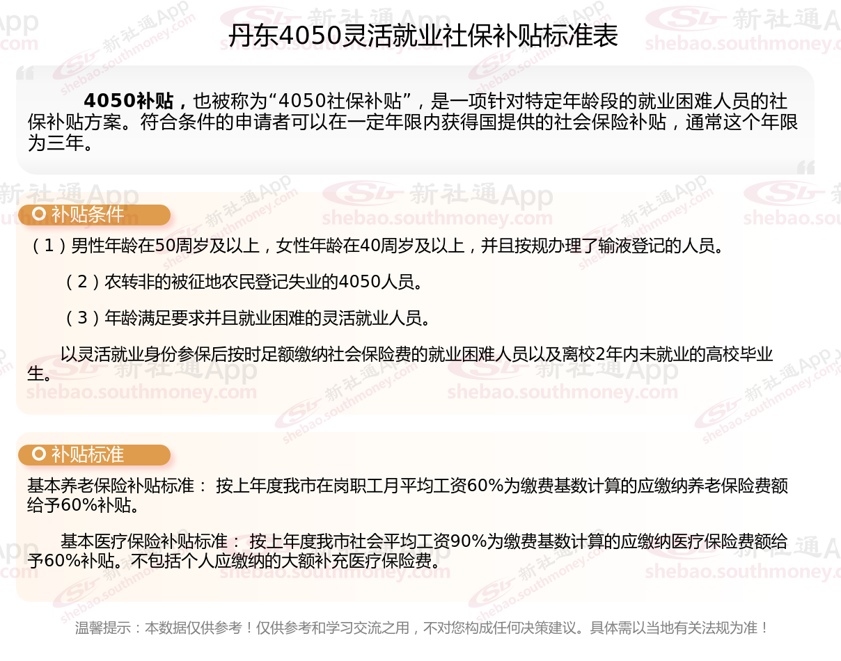 二、2025年丹东4050社保补贴标准及条件,最新如下: