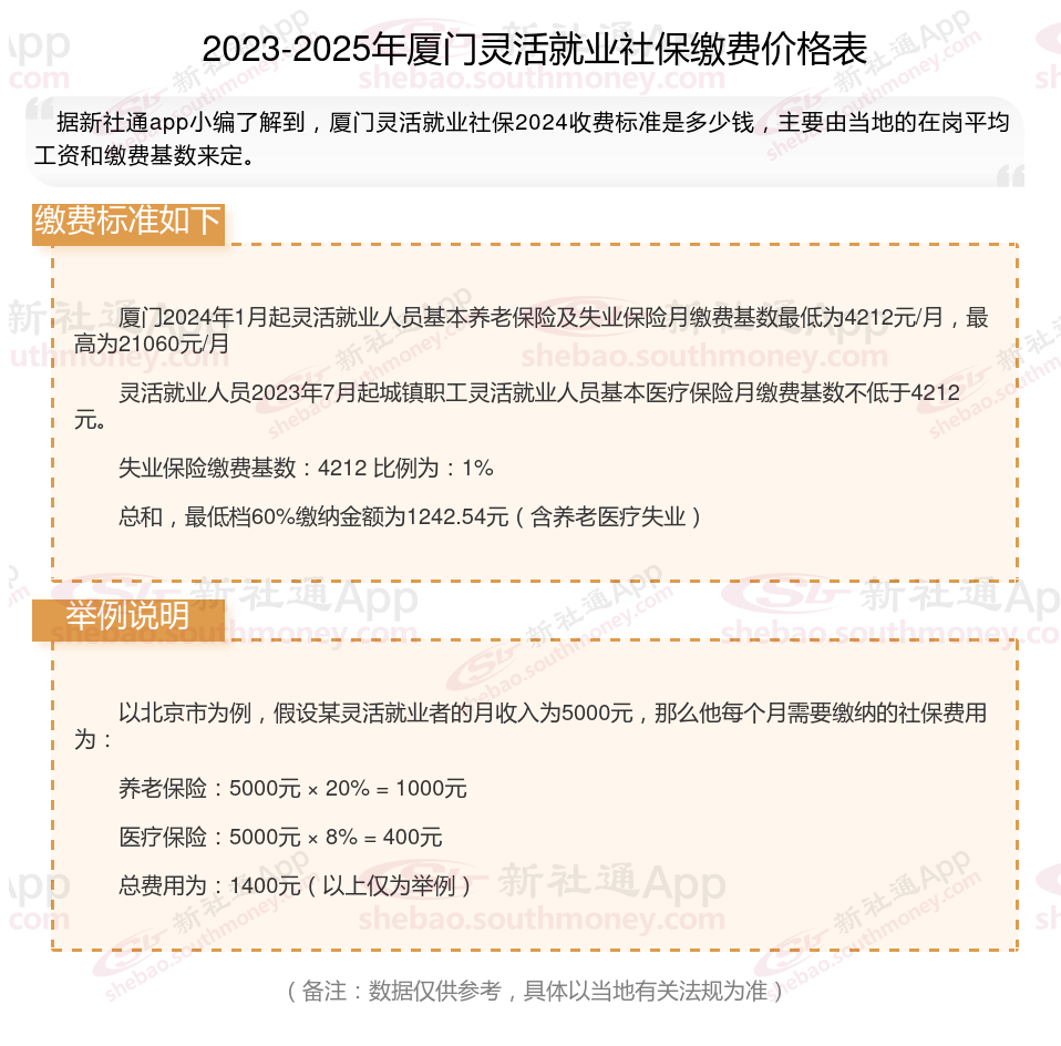据新社通app数据显示,厦门灵活就业养老缴费基数明细如下: