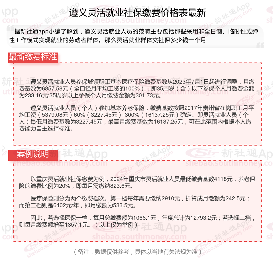 据新社通app数据显示,遵义灵活就业养老保险的缴费基数为:4363.35元。灵活就业人员参保缴费的比例为个人20%。