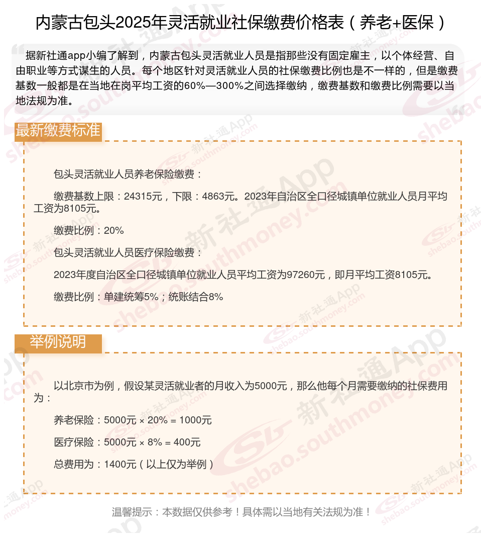 据新社通app数据显示,2024-2025年内蒙古包头灵活就业人员养老保险的缴费标准: