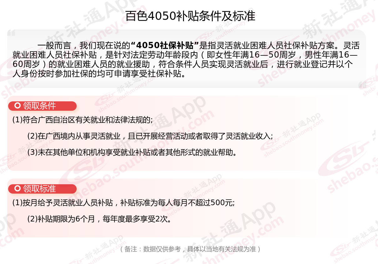 一、2025年百色灵活就业4050社保补贴标准及条件是什么