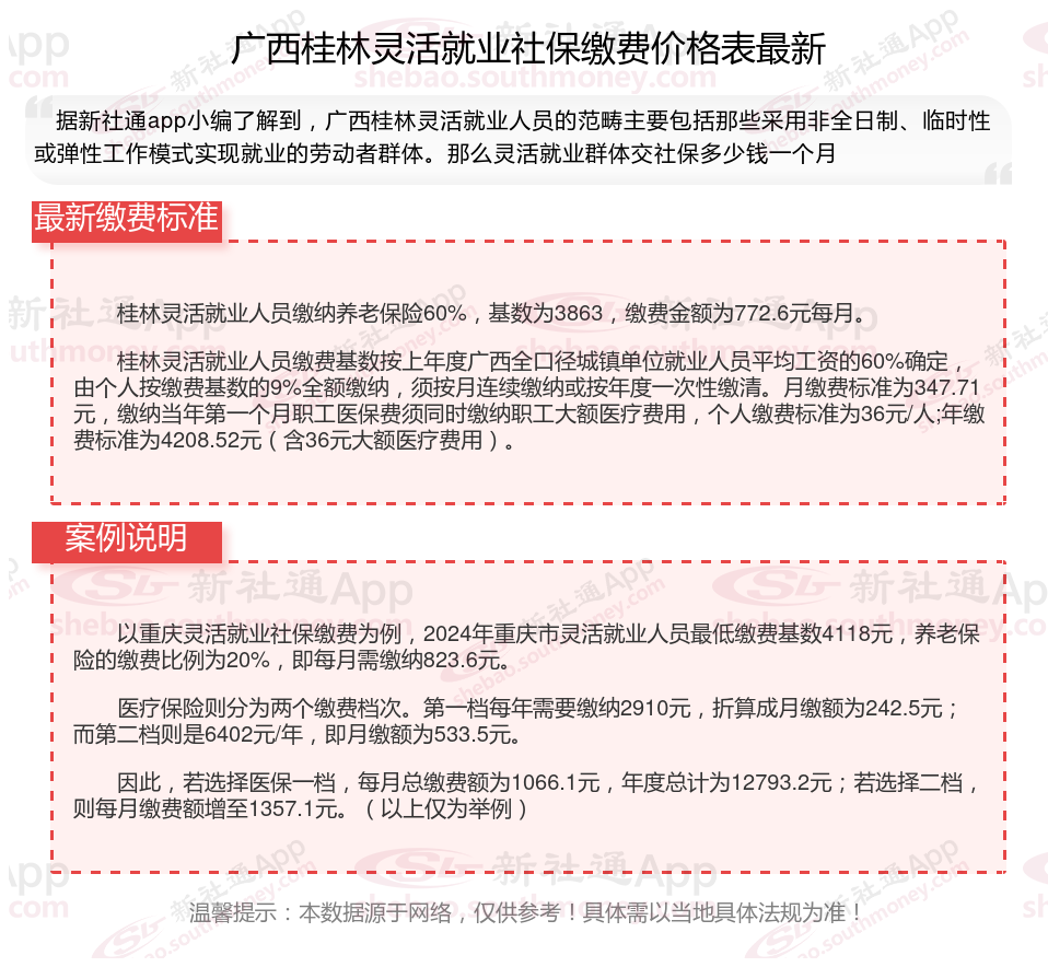 那么,广西桂林灵活就业人员社保缴费标准2024-2025最新来了,交社保有什么好处?根据新社通app-社保缴费查询工具提供的2025社保缴费标准详情数据: