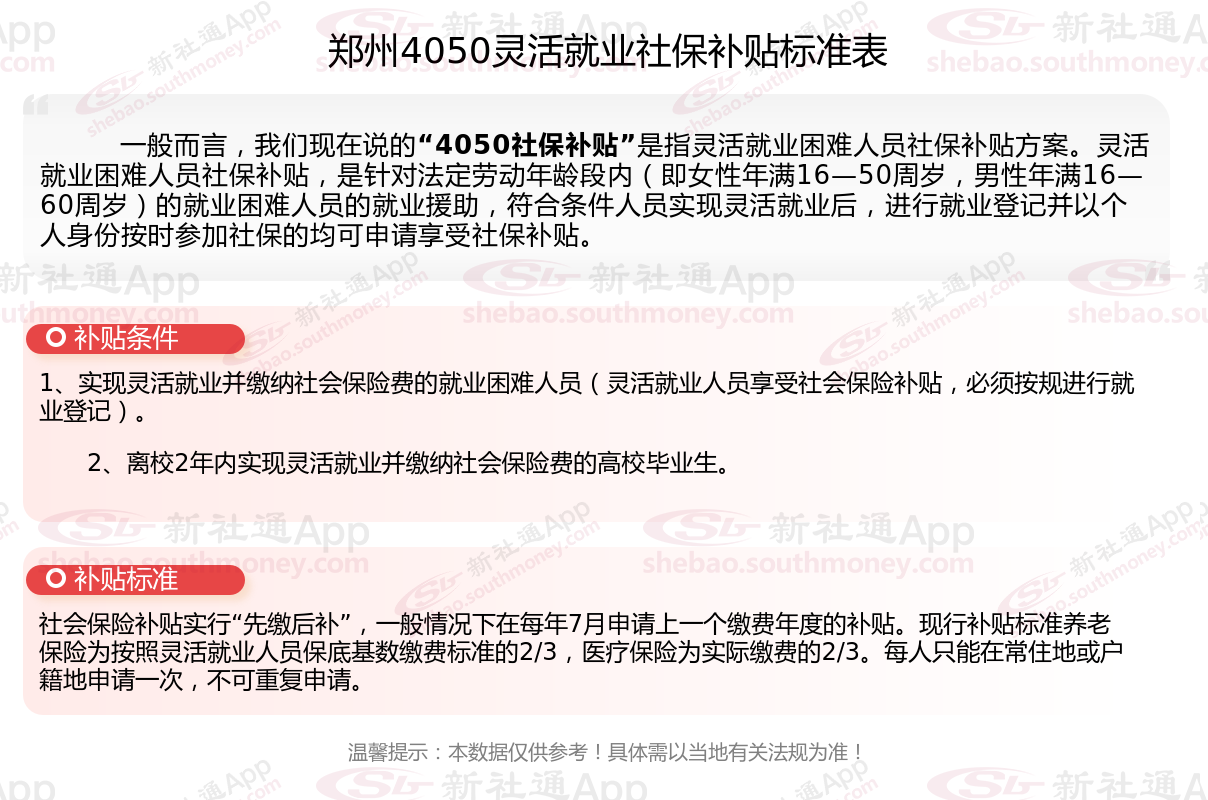 郑州4050灵活就业社保补贴是什么?今天聊一下4050补贴话题。44050社保补贴标准据新社通app小编了解,通常,4050社保补贴包含基本医疗保险和基本养老保险两个险种,社保补贴金额为申请人实际缴纳基本养老保险和基本医疗保险金额的2/3,具体标准以当地社保局公布的数据为准!那么郑州4050灵活就业社保补贴标准是多少钱?郑州4050社保补贴可以领取多少?接下来随新社通APP小编了解一下郑州4050灵活就业社保补贴的最新资讯。