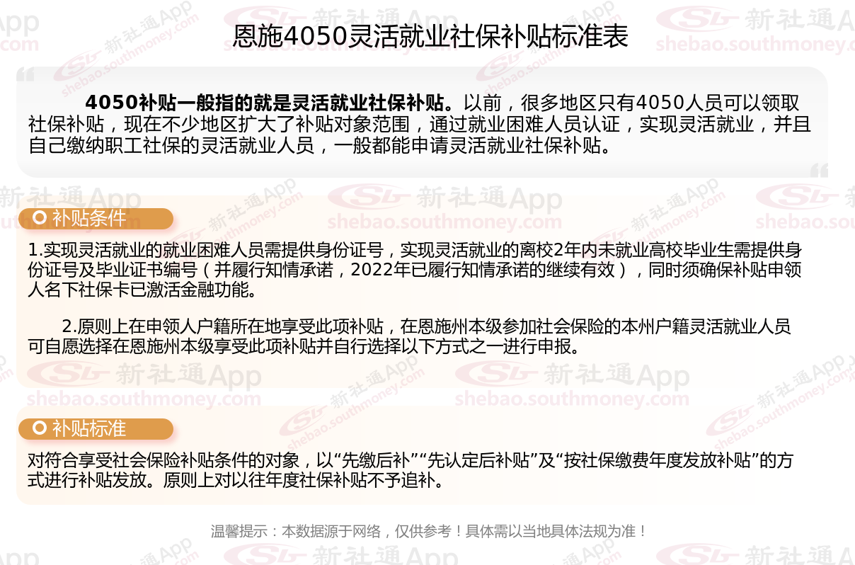 一、2025年恩施灵活就业4050社保补贴标准是多少?申请条件是什么?