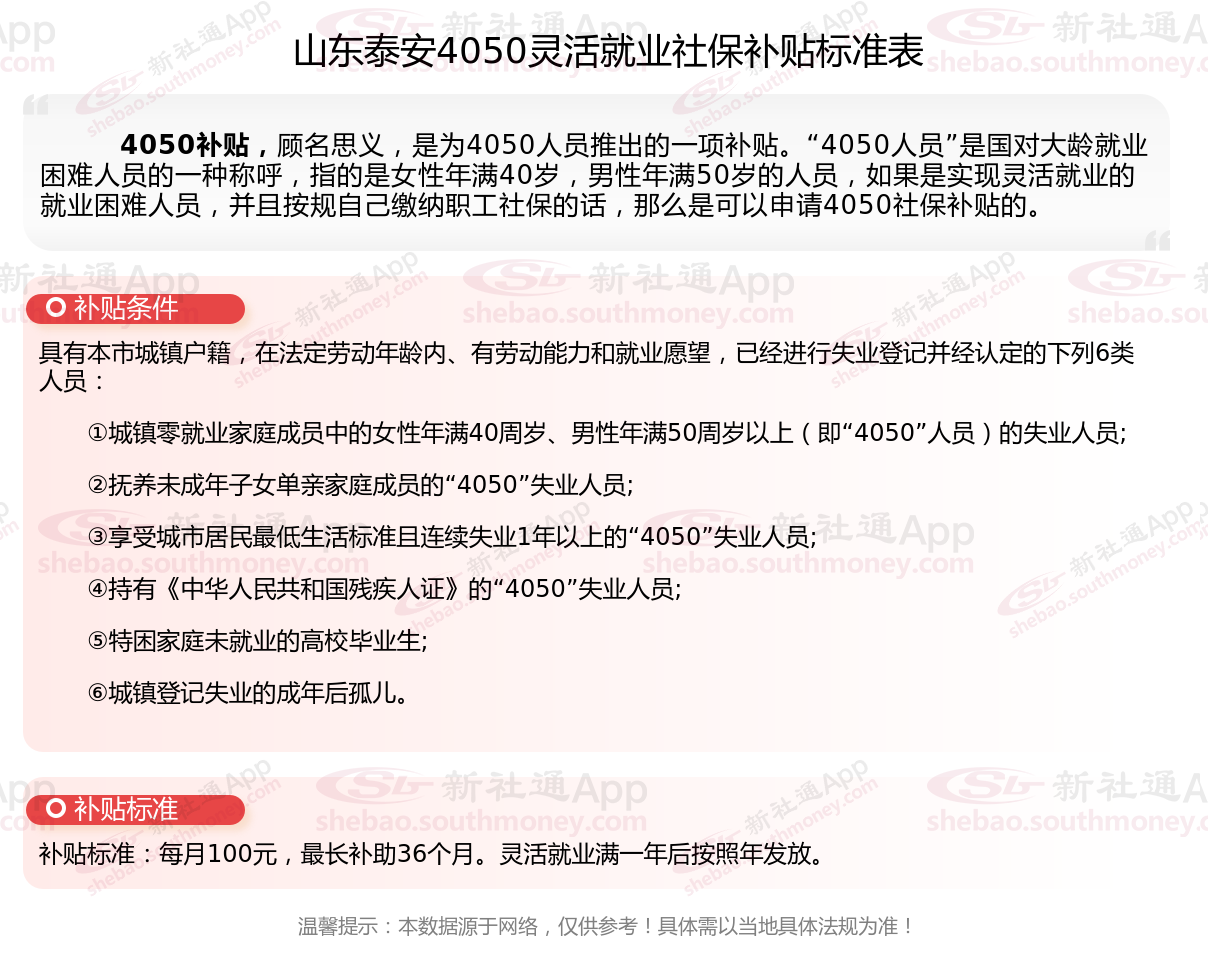 二、山东泰安4050社保补贴标准及条件2025年,最新如下