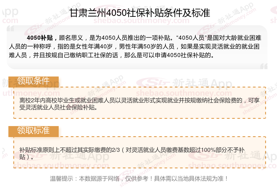 二、2025年甘肃兰州4050社保补贴标准及条件,最新如下: