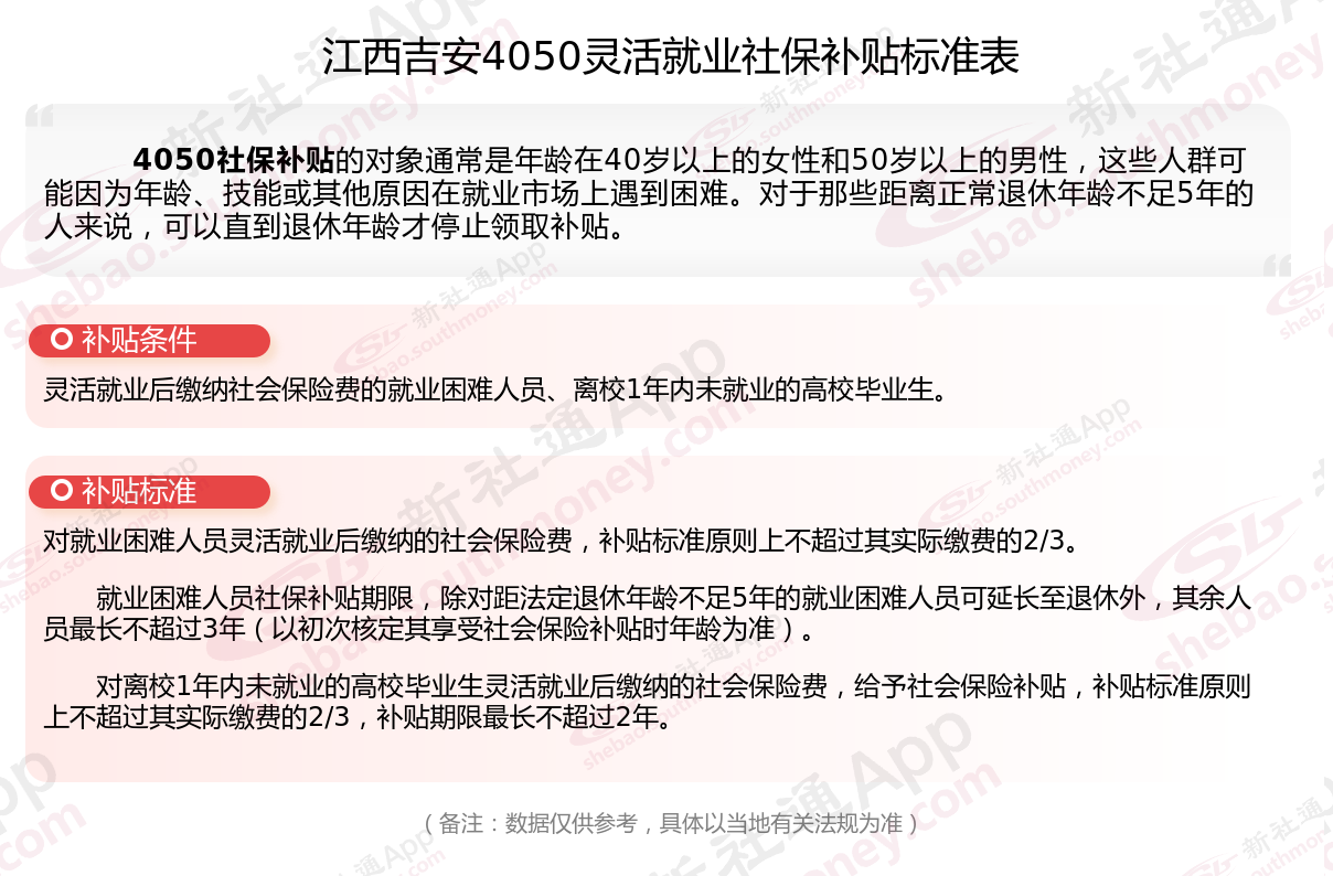 以上就是江西吉安4050灵活就业社保补贴的相关内容,欢迎关注新社通/下载新社通APP了解更多五险一金专业资讯。