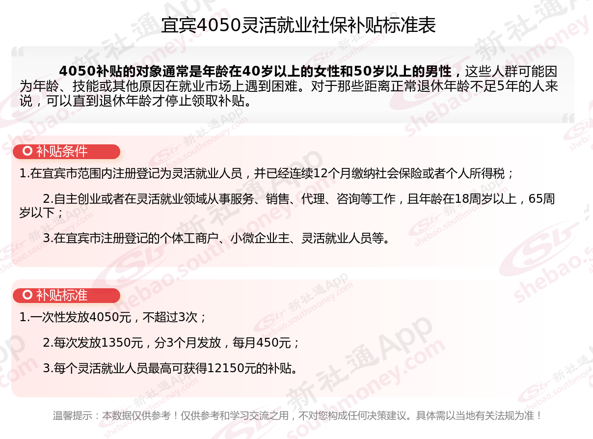 4050社保补贴标准据新社通app小编了解,通常,4050社保补贴包含基本医疗保险和基本养老保险两个险种,社保补贴金额为申请人实际缴纳基本养老保险和基本医疗保险金额的2/3,具体标准以当地社保局公布的数据为准!那么宜宾4050灵活就业困难人员社保补贴标准是多少?宜宾4050社保补贴需要符合什么条件?接下来随新社通APP小编具体了解一下4050社保补贴内容。