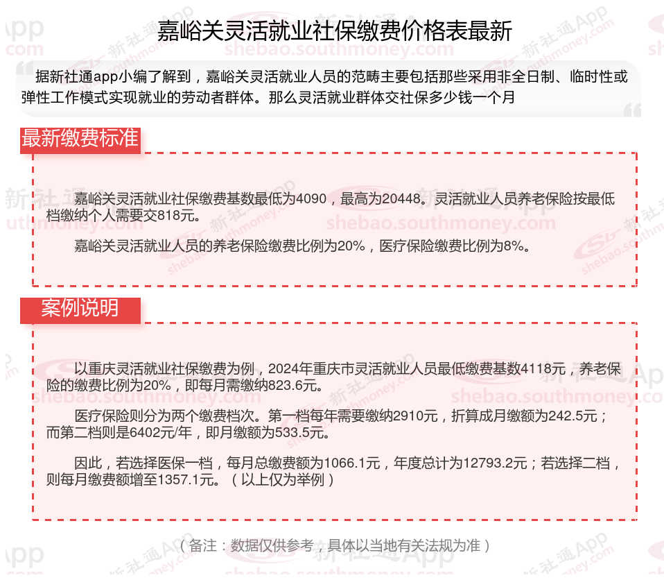 嘉峪关灵活就业社保缴费标准,嘉峪关社保缴费多少钱?下表是2024-2025年嘉峪关社保费用明细参考,根据新社通app-社保缴费查询工具提供的最新数据如下: