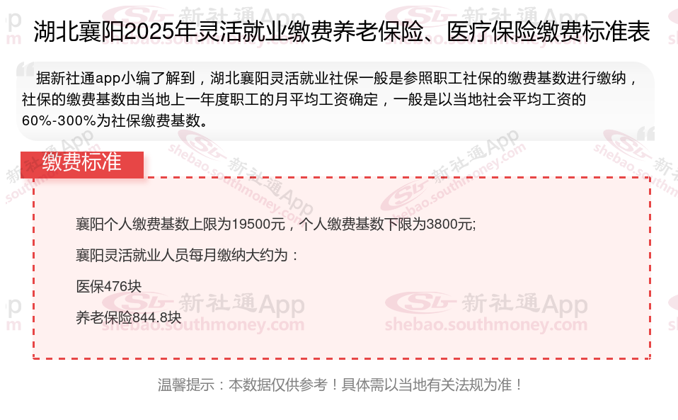 据新社通app数据显示,湖北襄阳灵活就业人员养老保险缴费基数2024-2025年最新标准如下:
