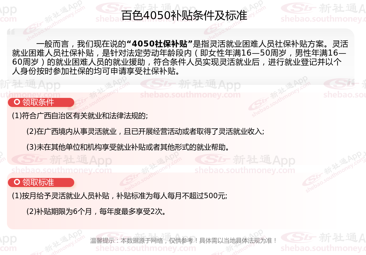 一、百色4050社保补贴标准是什么?附条件