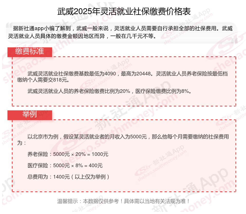 据新社通app数据显示,2024-2025年武威灵活就业人员养老保险的缴费标准是根据缴费基数来确定的: