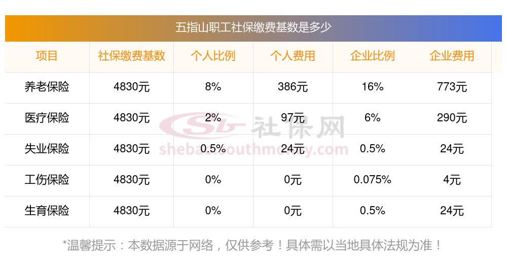 五指山缴费社保比例一览 社保公司和个人各交多少?下表是2024-2025年五指山社保费用明细参考,新社通app-社保缴费查询工具提供的最新数据如下: