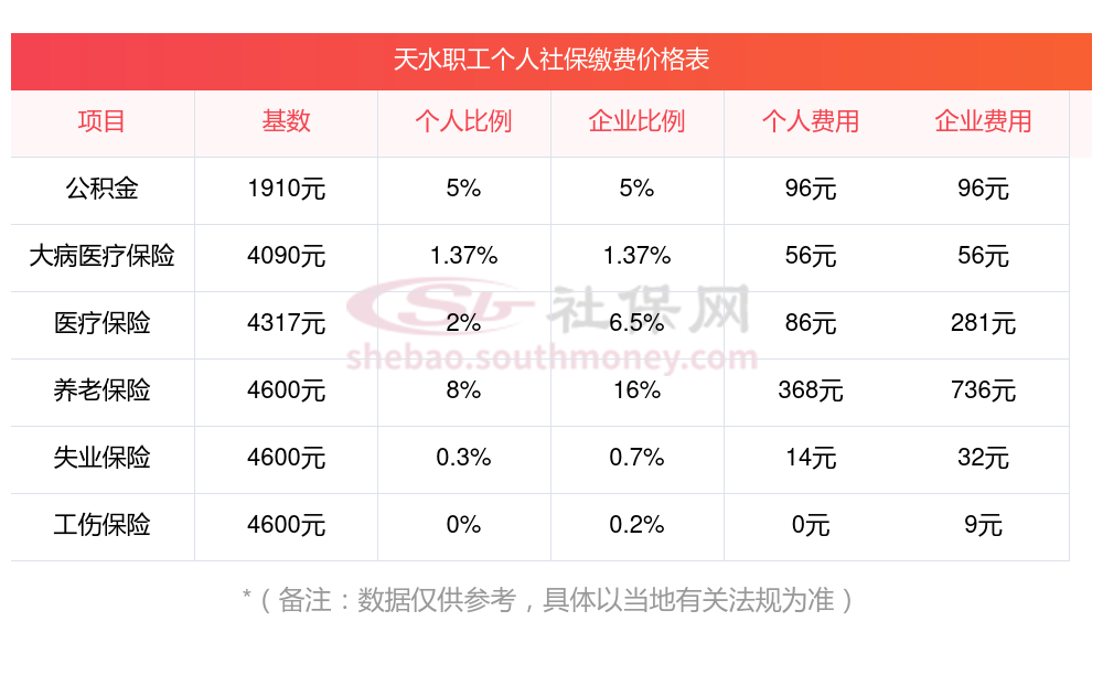 社保缴纳比例一览,社保公司和个人各交多少?下表是2023-2024年天水社保费用明细参考,新社通app-社保缴费查询工具提供的最新数据如下: