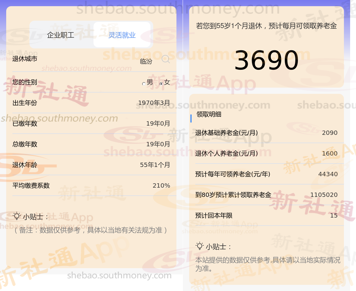 朋友秦某退休城市在临汾,性别:女,出生年份:1970,总缴年数19年,缴费档次:210%,新社通app养老金计算器所得:
