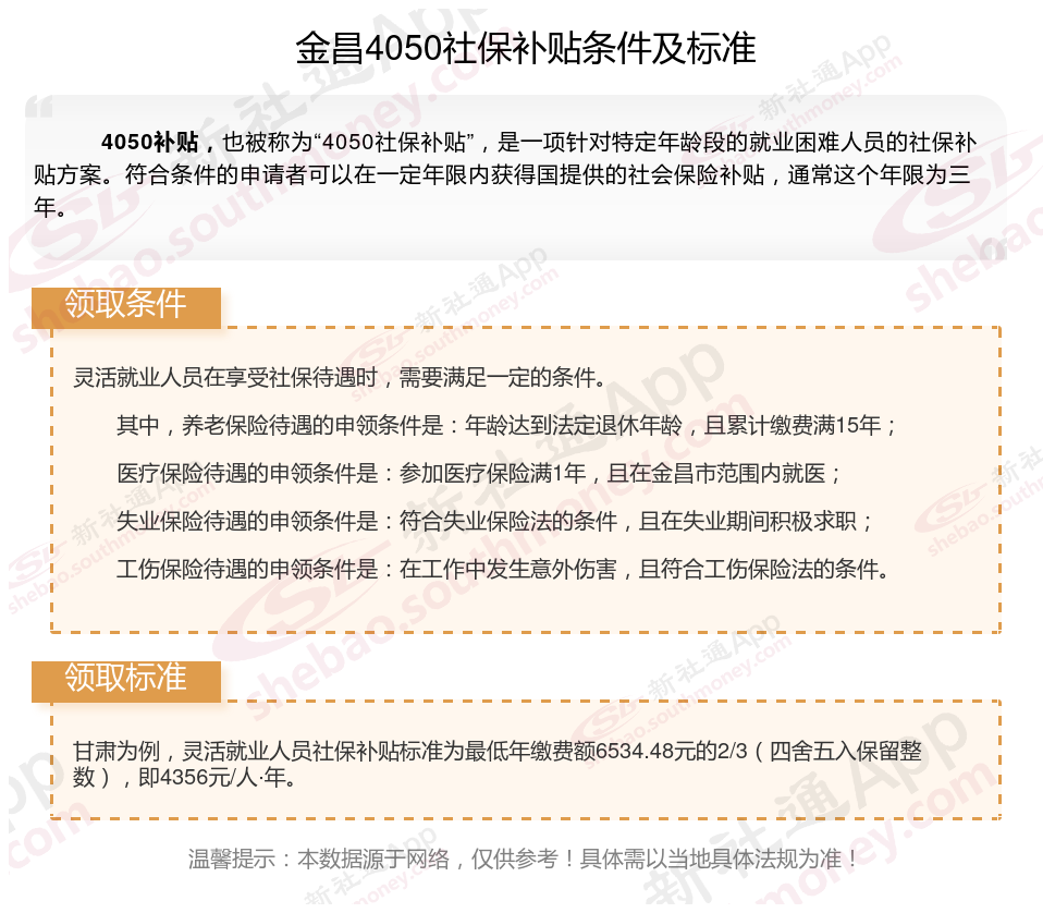 二、2025年金昌4050社保补贴标准及条件