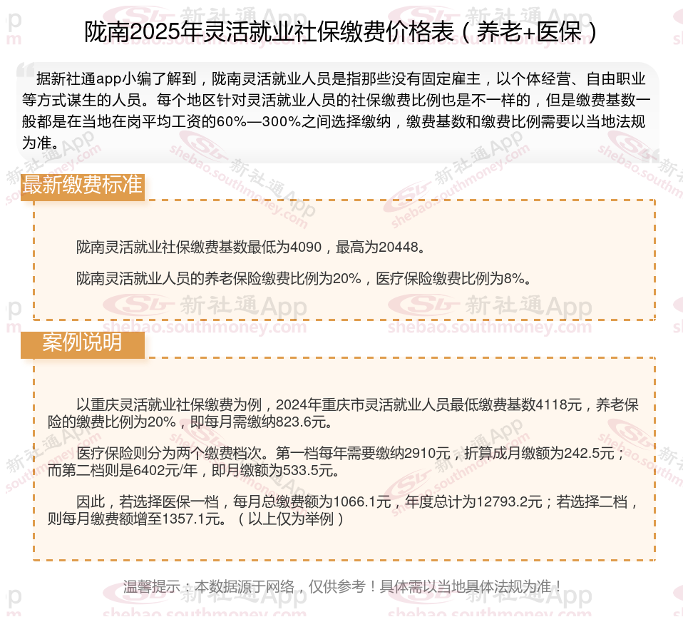 那么,自由职业社保是多少钱一个月 陇南灵活社保交多少钱?根据新社通app-社保缴费查询工具提供的2025社保缴费标准详情数据: