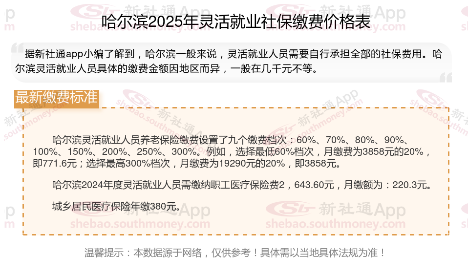据新社通app数据显示,2024-2025年哈尔滨灵活就业人员养老保险的缴费标准: