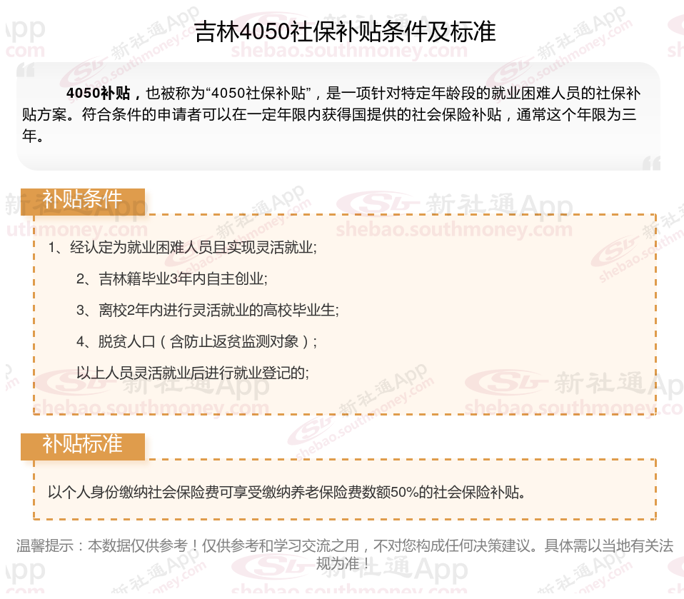 二、2025年吉林4050社保补贴标准及条件,最新如下: