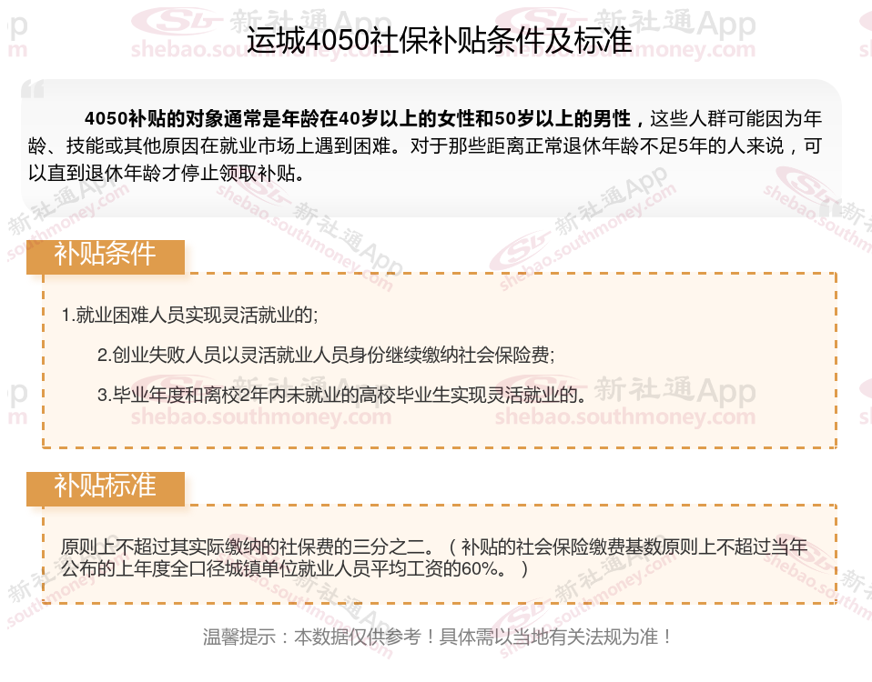 2025运城4050补贴主要针对的是年龄在40岁以上的女性和50岁以上的男性,这些人群通常因为年龄较大而面临就业困难。