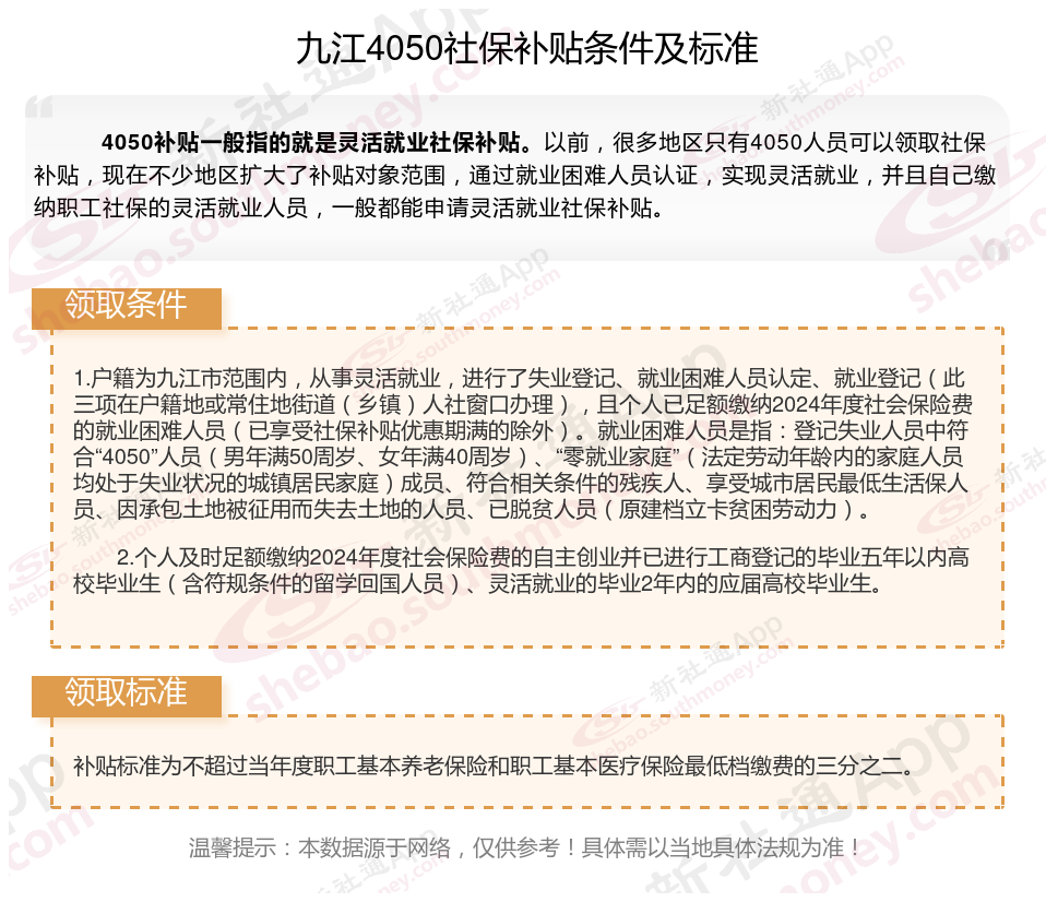 2025九江4050补贴主要针对的是年龄在40岁以上的女性和50岁以上的男性,这些人群通常因为年龄较大而面临就业困难。