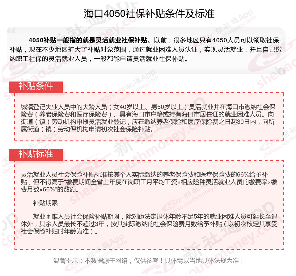 二、2025年海口4050社保补贴标准(海口4050灵活就业人员补贴标准是多少钱?海口2025年4050补贴新规能领多少钱?)