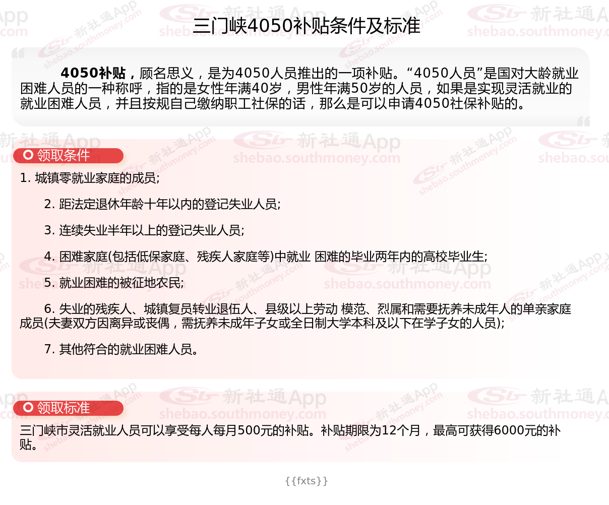 今天聊一下4050补贴的相关内容。4050补贴听起来像是一个针对特定年龄人群的社保补贴。比如女性需年满40周岁,男性需年满50周岁(以申请当年12月31日为截止日期)。那么三门峡4050灵活就业困难人员社保补贴多少钱?三门峡4050社保补贴可以申请吗?接下来随新社通APP小编具体了解一下4050社保补贴内容。