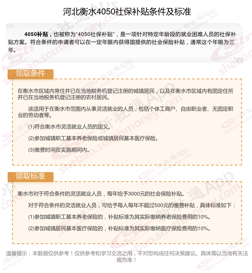 二、2025年河北衡水4050社保补贴标准及条件,最新如下: