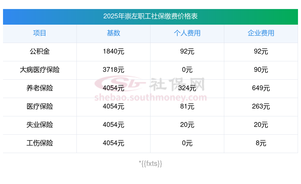 2025年崇左五险缴费标准是多少,2025年崇左社保缴费多少钱?下表是2025年崇左社保费用明细参考,新社通app-社保缴费查询工具提供的最新数据如下: