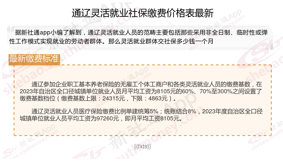 据新社通app数据显示,通辽灵活就业人员养老保险缴费基数2024-2025年最新标准如下: