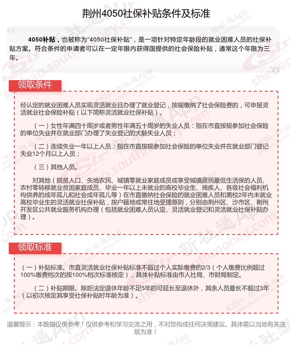 一、荆州4050社保补贴标准及条件2025年最新消息
