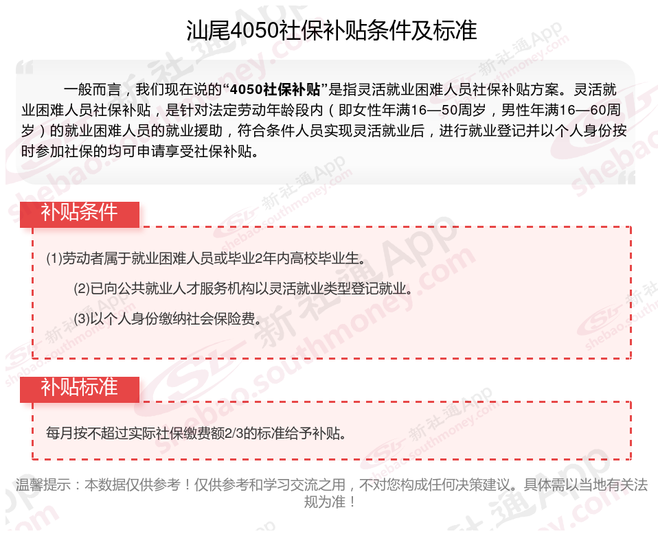 二、2025年汕尾4050社保补贴标准是多少?领取条件是什么?