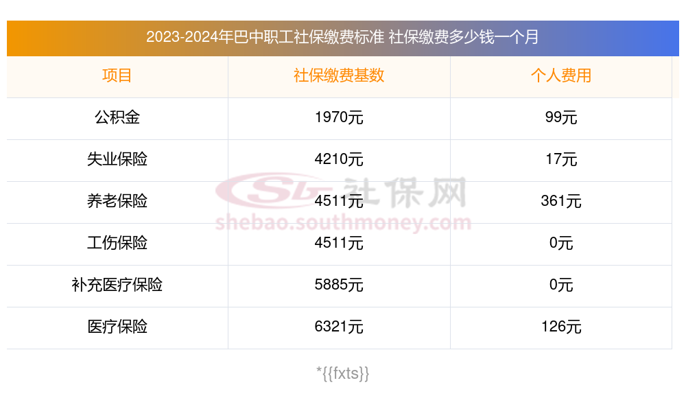 2025年巴中社保缴费多少钱?下表是2023-2024年巴中社保费用明细参考,如下: