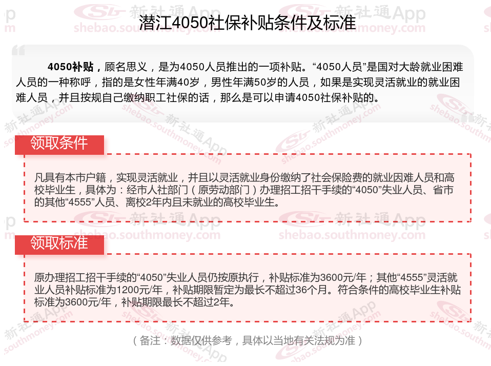 潜江4050灵活就业社保补贴是什么?今天聊一下4050补贴话题。4050补贴听起来像是一个针对特定年龄人群的社保补贴。比如女性需年满40周岁,男性需年满50周岁(以申请当年12月31日为截止日期)。那么潜江4050灵活就业社保补贴标准是多少钱?潜江4050社保补贴可以领取多少?接下来随新社通APP小编了解一下潜江4050灵活就业社保补贴的最新资讯。