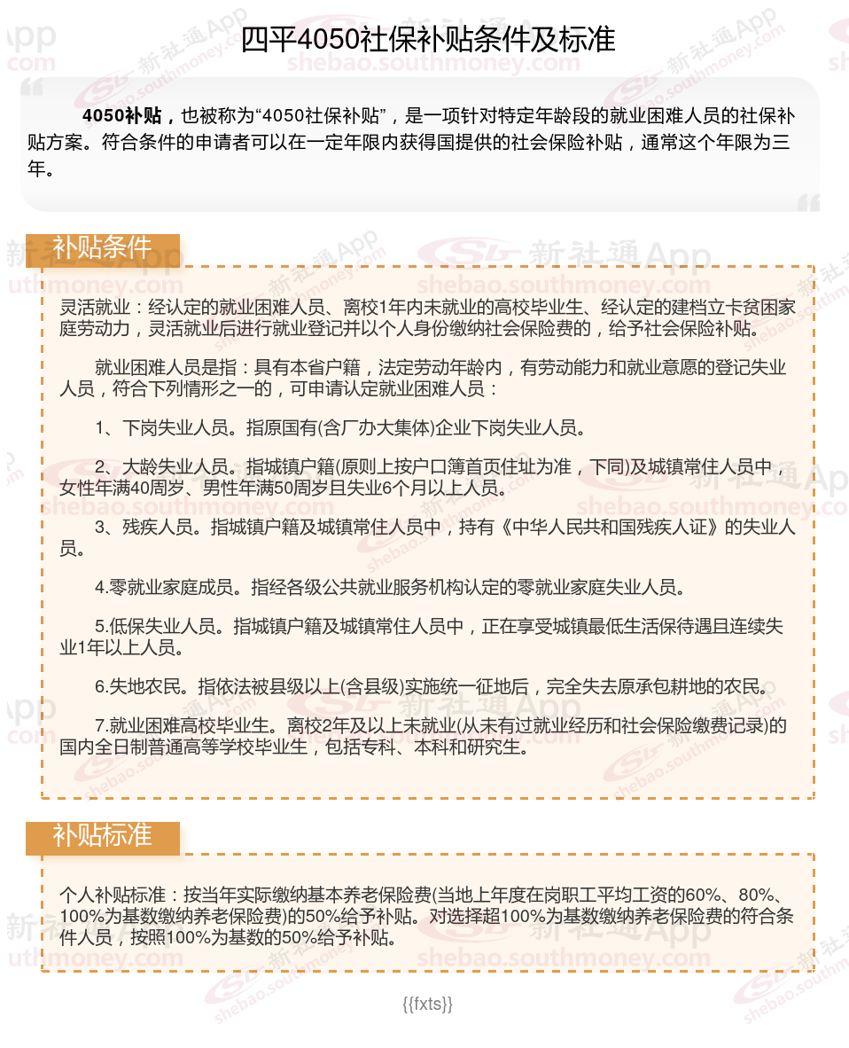 “4050人员”是国对大龄就业困难人员的一种称呼,指的是女性年满40岁,男性年满50岁的人员,那么四平4050灵活就业社保补贴标准是多少钱?四平4050社保补贴条件是什么?接下来随新社通APP小编了解一下最新资讯。