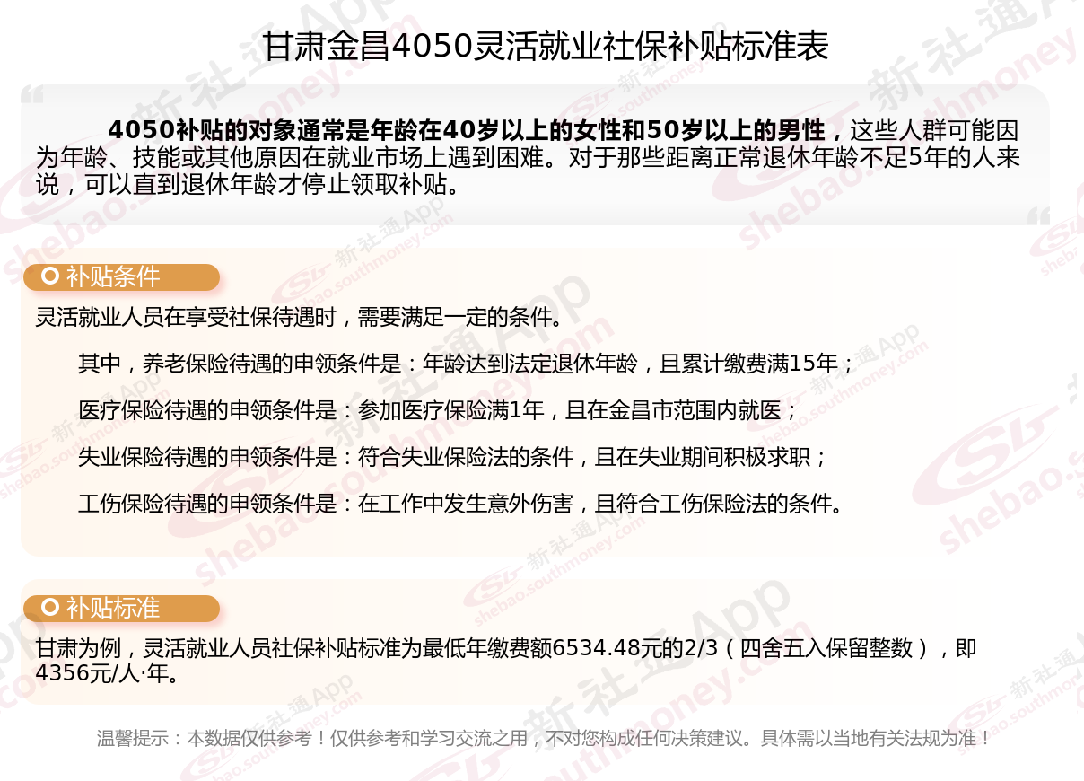 二、2025年甘肃金昌4050社保补贴标准及条件,最新如下: