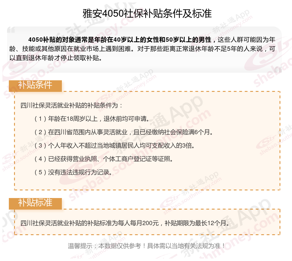 一、2023-2024年雅安4050社保补贴标准及条件是多少?