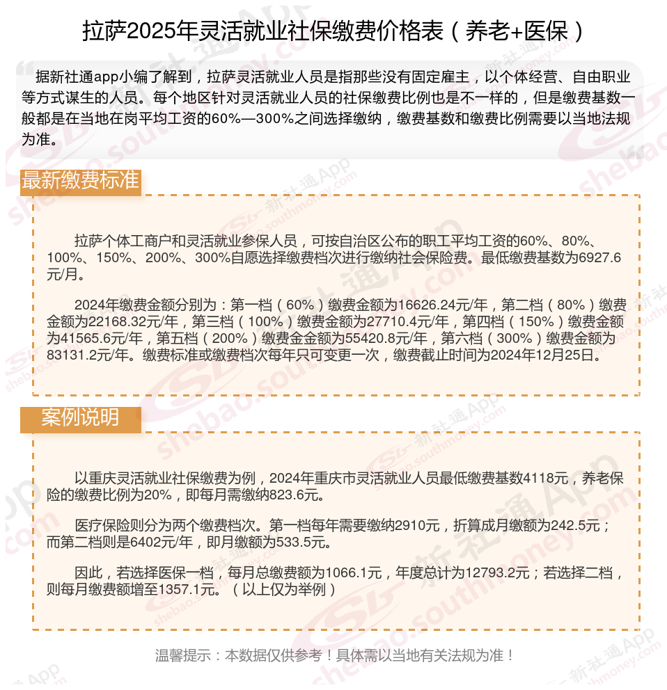 一、2025年拉萨灵活就业人员社保养老+医保缴费标准一年多少钱?