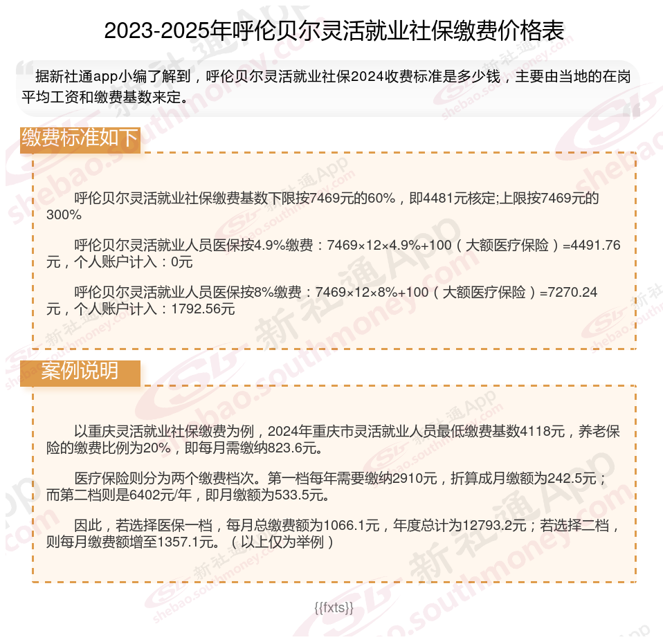据新社通app数据显示,2024-2025年呼伦贝尔灵活就业人员养老保险的缴费标准是根据缴费基数来确定的: