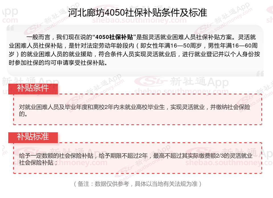 一、河北廊坊4050社保补贴标准是什么?附条件