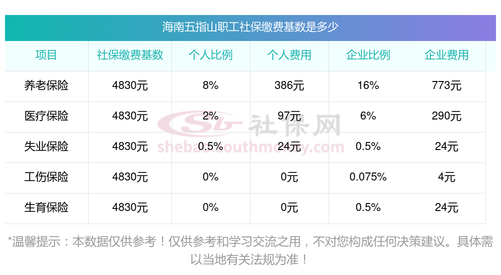 2025年海南五指山社保缴费多少钱?下表是2023-2024年海南五指山社保费用明细参考,如下: